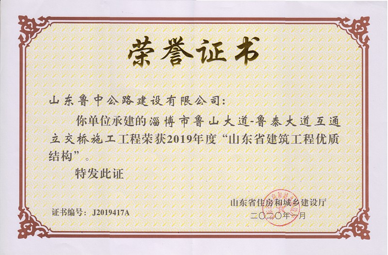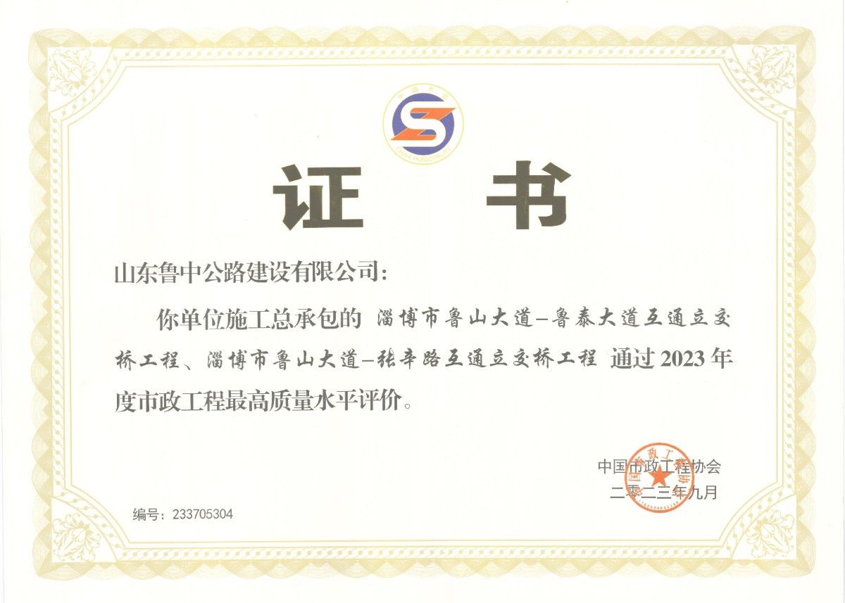 - 淄博市魯山大道-魯泰大道互通立交橋、魯山大道-張辛路互通立交橋工程獲2023年度市政工程最高質量水平評價