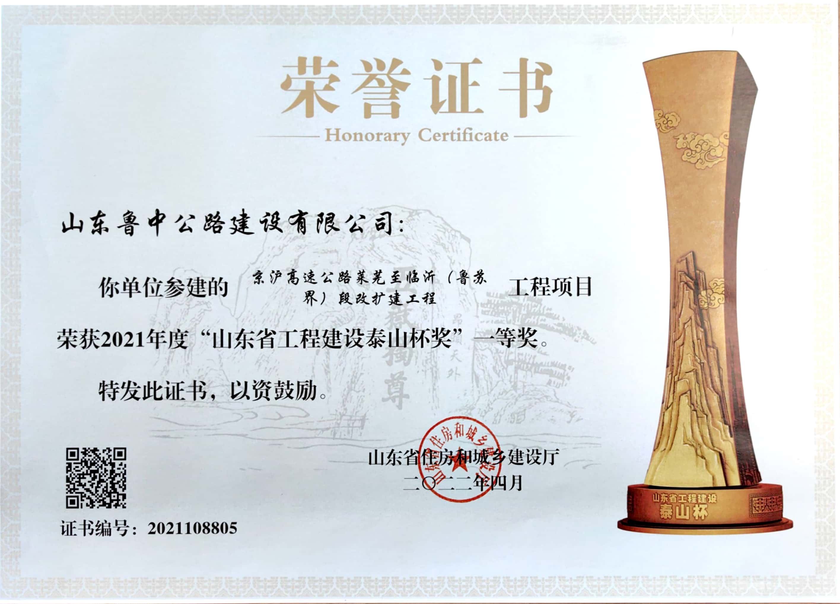 - 京滬高速公路萊蕪至臨沂(魯蘇界)段改擴建工程榮獲2021年度“山東省工程建設泰山杯獎“一等獎”