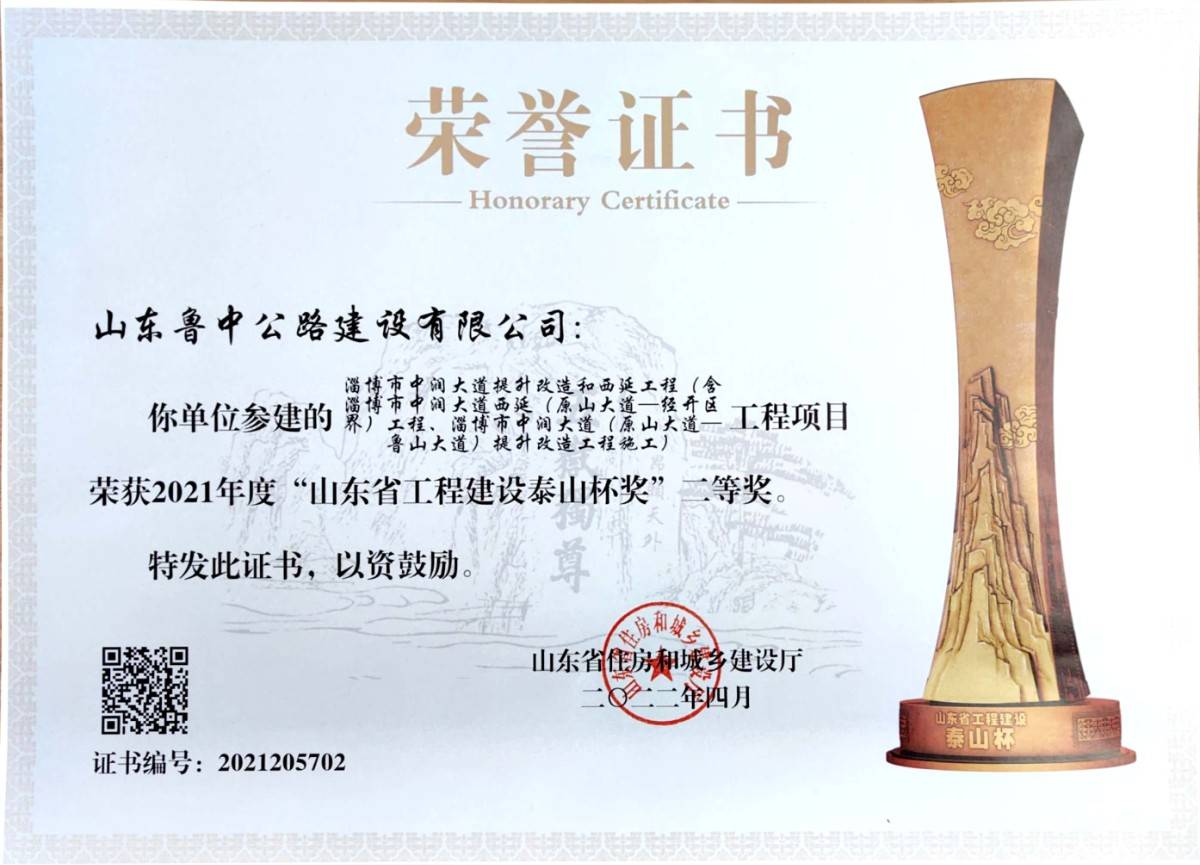 - 淄博市中潤大道提升改造和西延工程榮獲2021年度”山東省工程建設泰山杯獎“二等獎