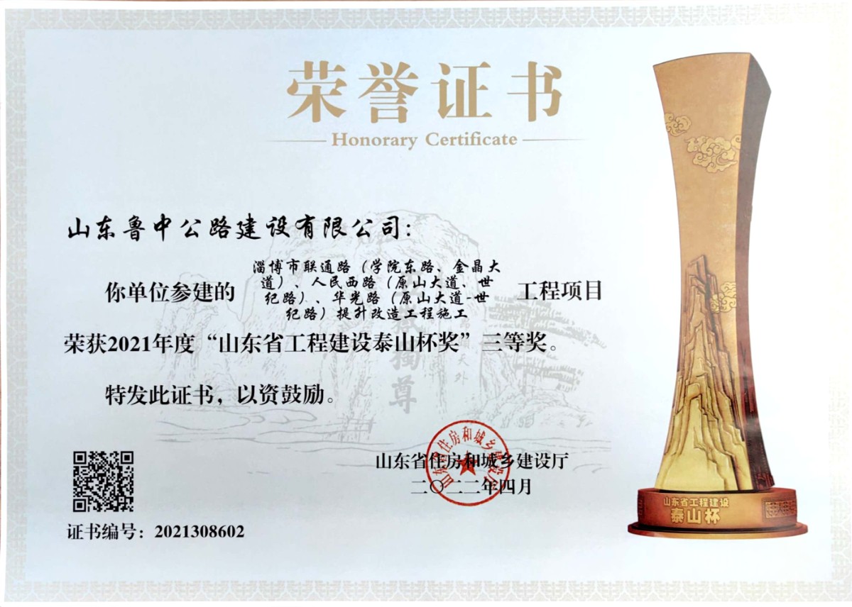 - 淄博市聯通路、人民西路、華光路提升改造工程榮獲2021年度”山東省工程建設泰山杯獎“三等獎