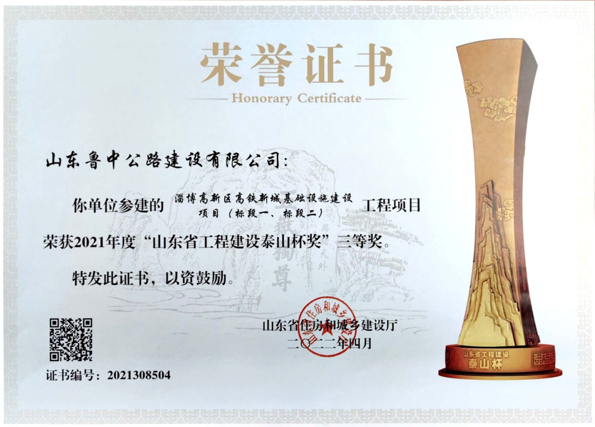 - 淄博高新區高鐵新城基礎設施建設項目榮獲2021年度”山東省工程建設泰山杯獎“三等獎