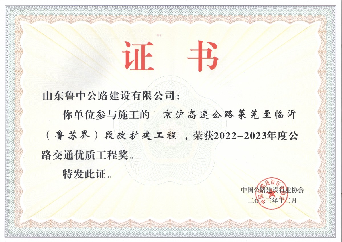 - 京滬高速公路萊蕪至臨沂(魯蘇界)段改擴建工程榮獲2022-2023年度公路交通優質工程獎