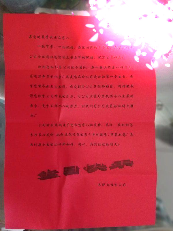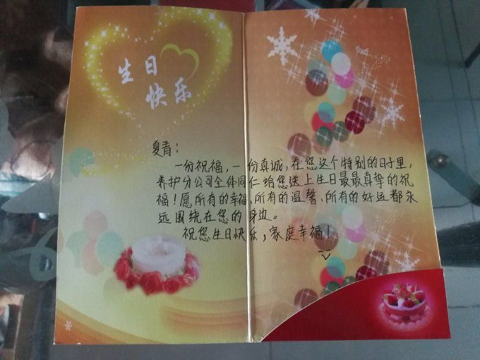 我自參加工作以來第一次去到公路施工第一線,常駐工地才切身體會到了身在工地不能按時回家的辛苦。早在6月份時,養護分公司辦公室人員就提前詢問大家的生日,我們也因此早知道公司要給大伙祝賀生日,可當我真正收到賀卡、蛋糕、禮物的時候,心里還是非常感動,心情非常激動,由衷的感謝公司各位領導的關愛。