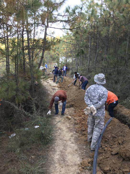 我們今天的任務(wù)是鋪設(shè)拌合站供水管線,如果沒(méi)有充足的水源,就會(huì)限制拌合樓的生產(chǎn),秉承著“兵貴神速”的作戰(zhàn)原則,為了盡快完成任務(wù),我部工作人員全部出動(dòng),在項(xiàng)目部各級(jí)領(lǐng)導(dǎo)帶領(lǐng)下上山埋設(shè)管道。我們用腳步丈量高山,用鐵鍬鏟起凍硬的泥土,徒步扛著水管穿過(guò)樹(shù)林。