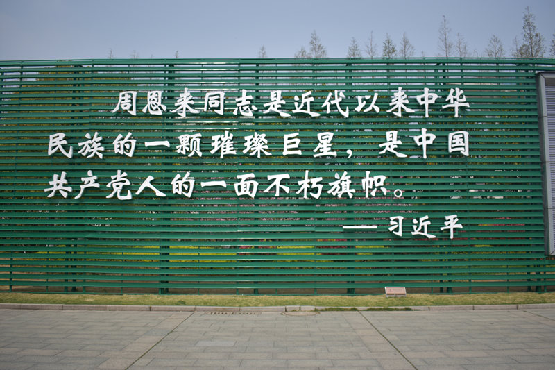 移步換景,主館后是周總理銅像,銅像總高度7.8米,寓意總理走過的78個(gè)光輝人生,其姿勢(shì)取材于周恩來與農(nóng)民親切交談時(shí)的習(xí)慣動(dòng)作——雙手叉腰、面帶微笑,顯現(xiàn)出周恩來平易近人的風(fēng)范。