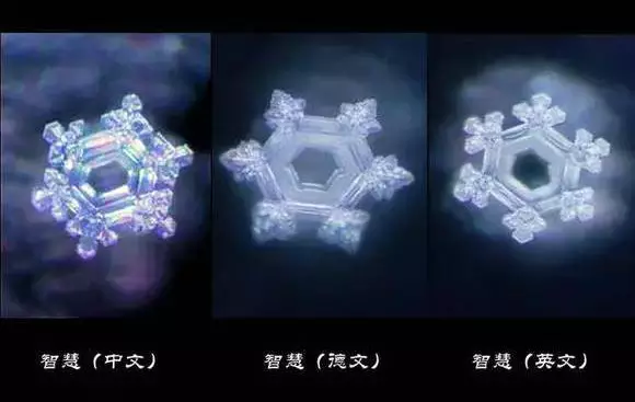聽無論是哪種語言,當水看到"智慧"后,其結晶都非常整齊而美麗。圖片依次為左圖智慧(中文)、右圖wisdom(英文)、中圖weishieit(德文)。