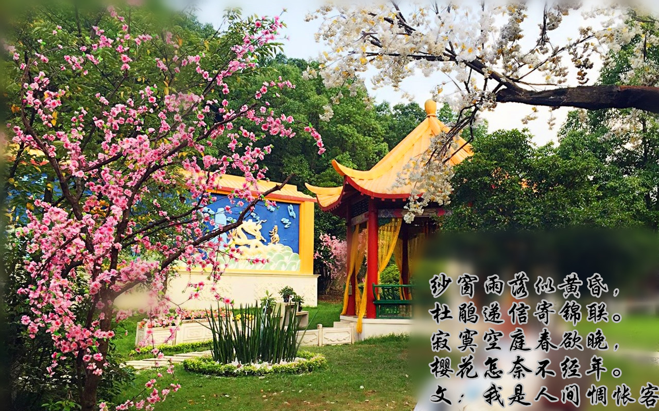 有道是,紗窗雨落似黃昏,杜鵑遞信寄錦聯。寂寞空庭春欲晚,櫻花怎奈不經年。