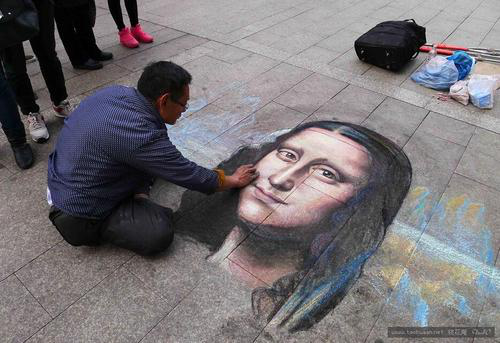 記得前幾天看到微信上的一篇推文,講述了“中國最牛乞丐”叢桂蘭的故事,可能他的事跡大家也是有所了解,一個破舊的行李包,一副拐杖,足以支撐他到處流浪35個年頭。16歲那年,他不幸得了骨腫瘤截肢,但命運的不公并沒有泯滅他的夢想,23歲那年他只身一人離開家鄉,開啟了他的夢想之路,起初雖懷著一顆熱愛繪畫的心,但因各種原因接觸到的專業知識少之又少,只能臨摹,在地上用粉筆畫一些簡單的小狗小貓。他個人尤其熱愛達芬奇的畫作,剛開始是臨摹,后來回家以后開始研究蒙娜麗莎的傾斜度是怎樣的,頭到手是多大距離,后來經過反復研究就將這些東西記在腦子里,到現在他已經在地上畫過蒙娜麗莎800多次,長2米左右,寬1.4米左右,反反復復用粉筆來回摩擦大概七八千次,差不多8個多小時才能完成,每次繪畫之前手上都要纏上厚厚的膠帶紙,雙手早已磨出了老繭,采訪時他說道:“現在手上的老繭,即使是玻璃碴子扎一下也不會出血”。每次出攤畫畫的時候都會引來無數行人的圍觀,但是他對網友評價他是“中國最牛乞丐”并不是很適應,他說,乞丐是直接伸手去要,而我就是要憑本事吃飯,我不丟人也不卑微,我最大的夢想就是去盧浮宮看蒙娜麗莎。