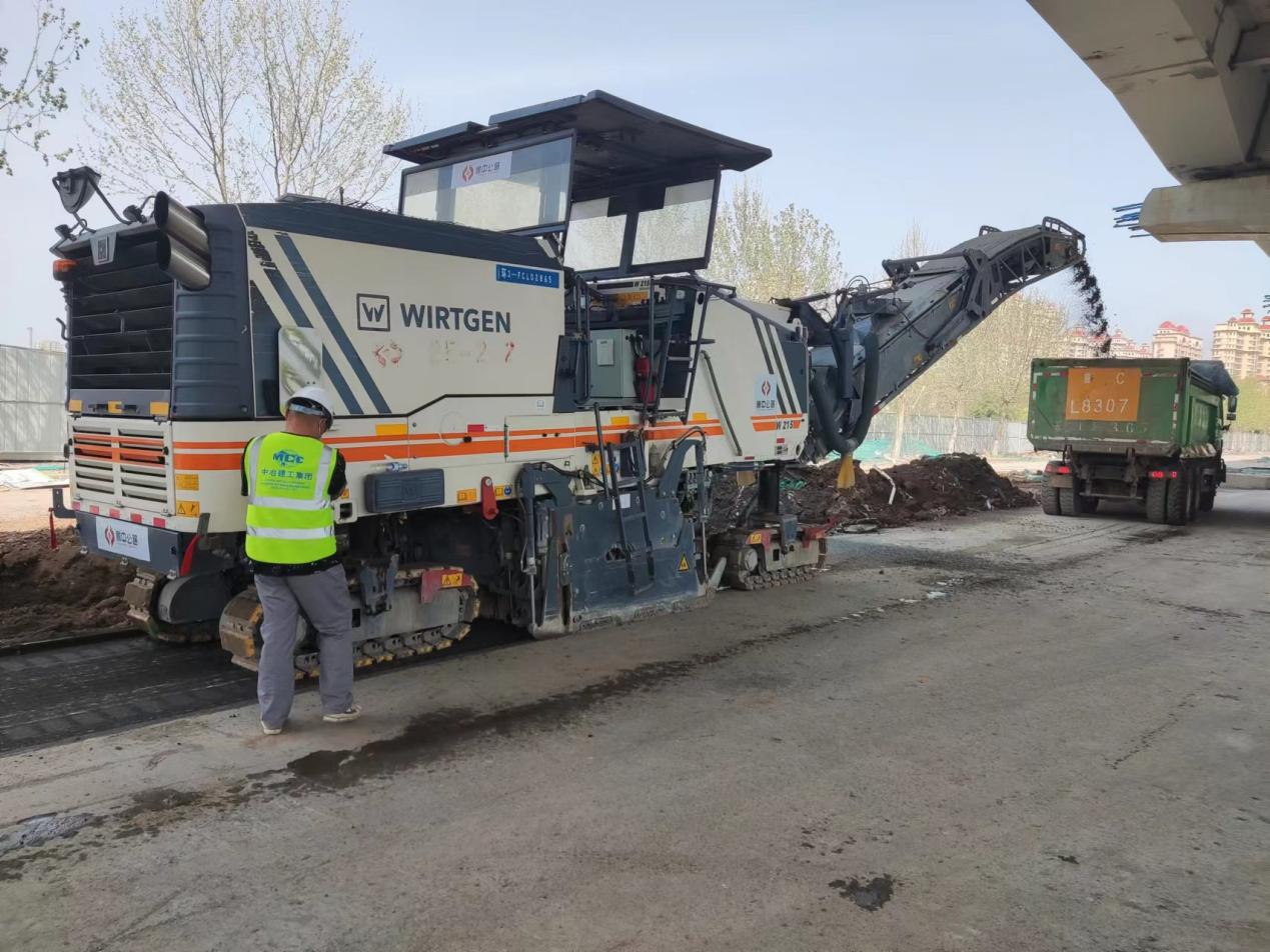4月10日,機械化施工公司銑刨機進場,展開主路面層銑刨工作。根據快速路高架橋需求,兩側各 11m 寬機動車道保留,進行病害處理、銑刨4cm 瀝青面層后罩面利用。保留兩側分隔帶、兩側輔路銑刨并罩面利用,現狀人行道翻建。高架橋增設進出口匝道段落、占用現狀兩側分隔帶、輔路的,對兩側分隔帶、輔路進行相應加寬改造、占用人行道部分,在外側新建人行道。
