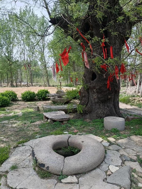 大槐樹樹齡600多年,見證了朝代的更迭,歷史的滄桑,及新社會的蓬勃。春天,大槐樹粗壯的枝干上,吐出了嫩綠的枝芽,顯得?機勃勃,村民多有來這祈福的,將紅繩綁在新發的枝干上,密密麻麻,山風裊裊,似一個起舞的紅裙少女。