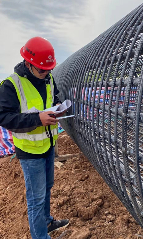 橋涵七工區李軒在對照圖紙對鋼筋籠進行量測
