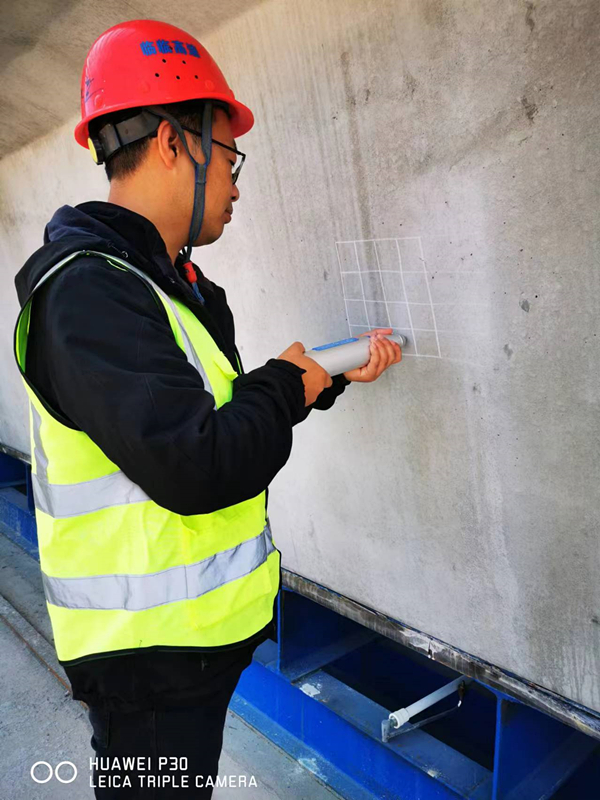 試驗室孫永賓在用回彈儀檢測預制箱梁強度