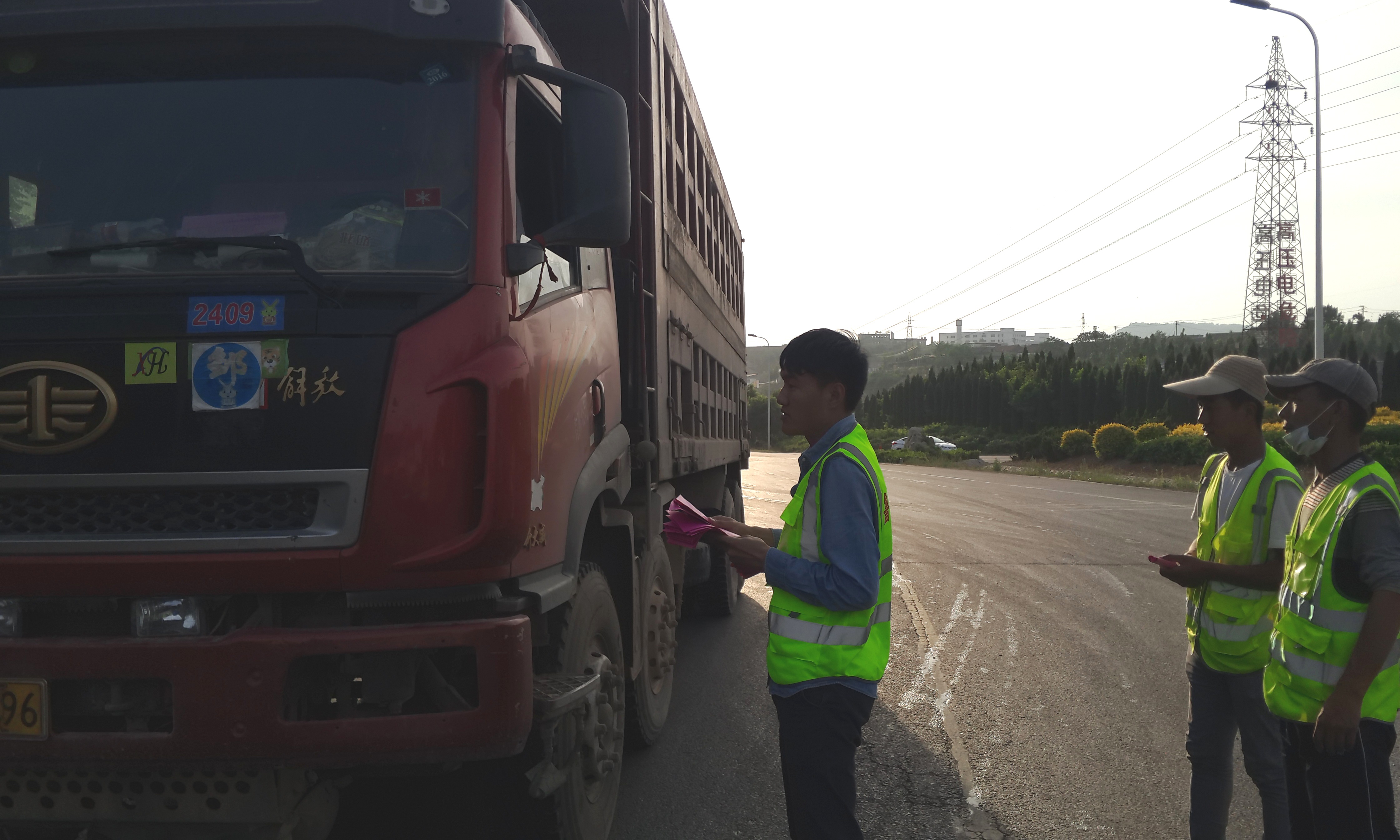 施工員向過往車輛發放傳單,告知博沂路封閉施工。
