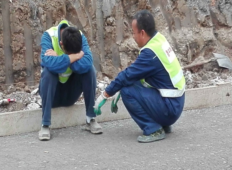 二零一六年十月二十日,上午九時(shí)左右,雅迪路原本就因?yàn)檐噥碥囃嚵髁看蠖中[,再加上水穩(wěn)攤鋪?zhàn)鳂I(yè),運(yùn)輸車和機(jī)械運(yùn)轉(zhuǎn)就顯得更是喧囂異常了。但是看著因大干期間,數(shù)日來晝夜趕工的工友們?cè)诘却碌拦ば蛲七M(jìn)前仰伏在崗位上時(shí),突然想起前蘇聯(lián)的衛(wèi)國(guó)戰(zhàn)爭(zhēng)片《這里的黎明靜悄悄》,真有異曲同工之妙。
